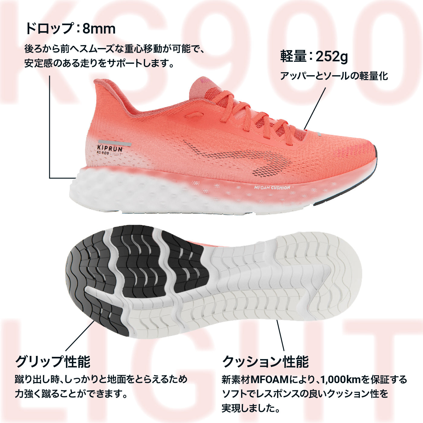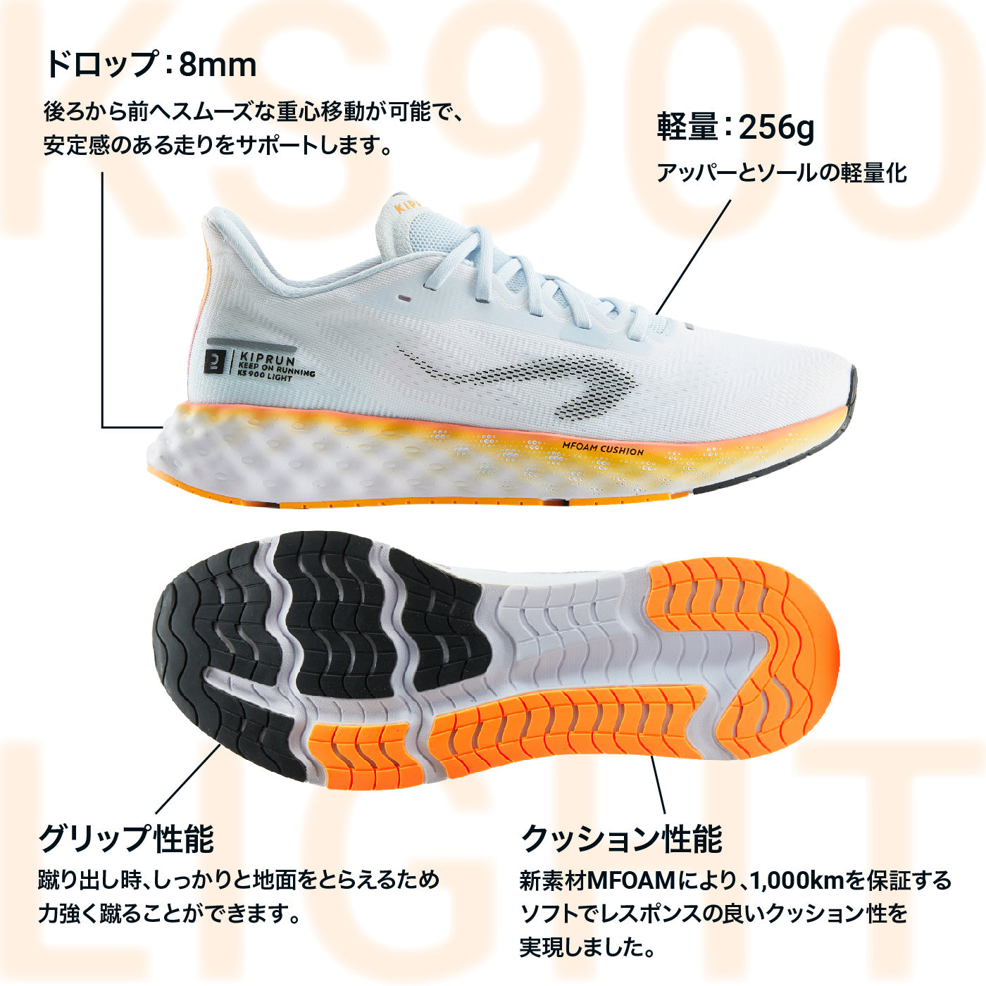 新素材MFOAMにより、1,000km持続するソフトでレスポンスの良いクッショニングを実現しました。通常ランニングシューズのクッション性持続距離の平均値は、500~800kmです。