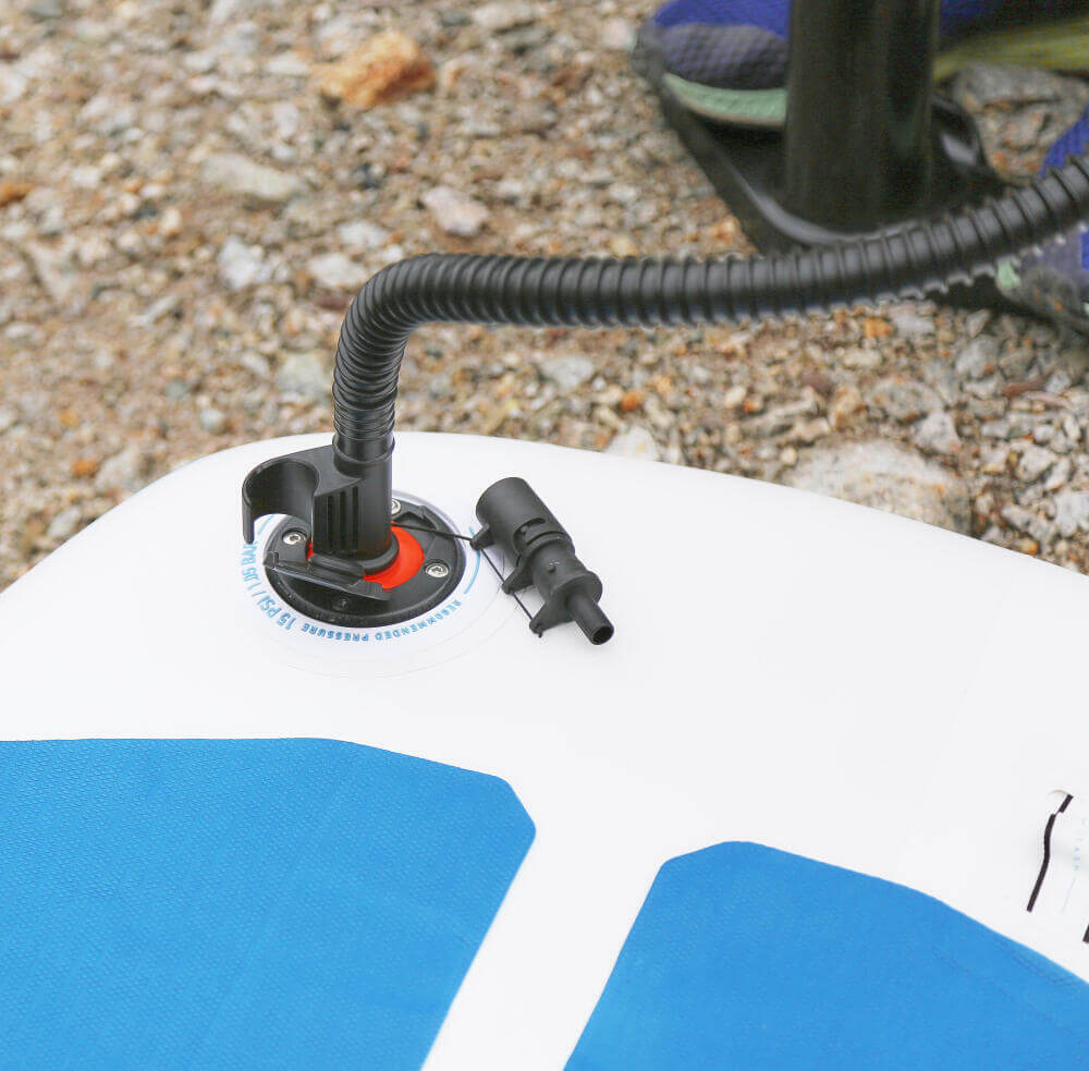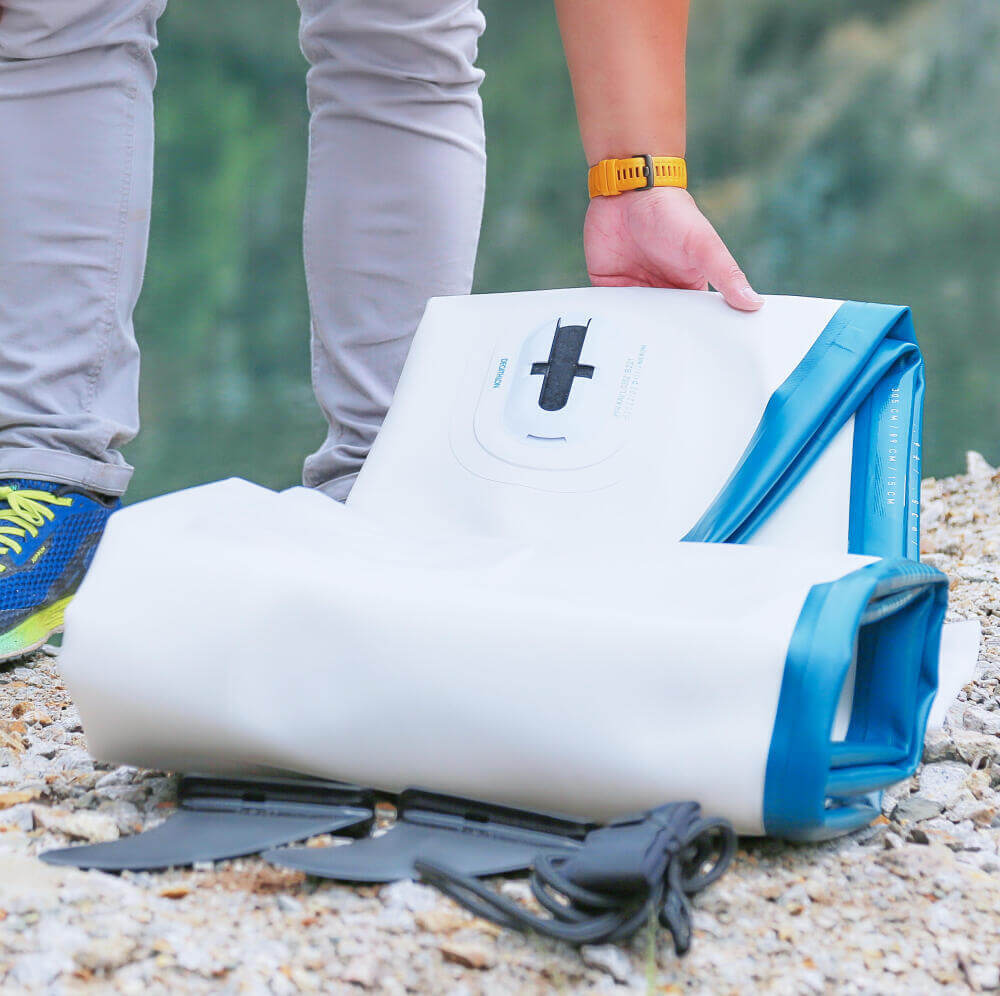 専用のポンプで空気を注入したら、ぱぱっと組み立てが完了。(Mサイズでおよそ6分)目的地に着いたらすぐにアクティビティが始めれる。片づける時はバルブを緩め、空気を抜いたら丸めるように折りたたんで撤収完了!