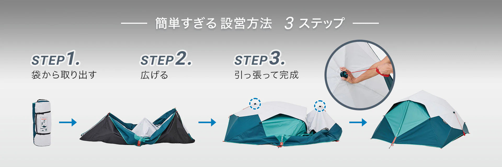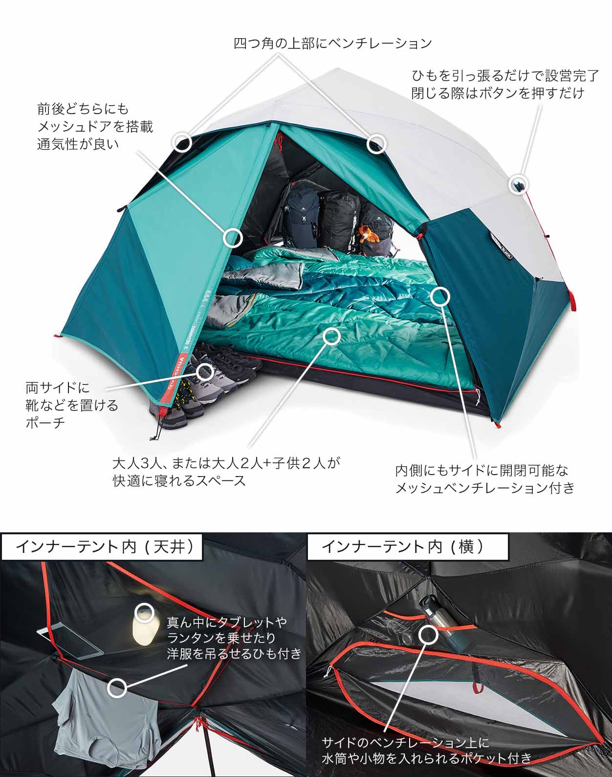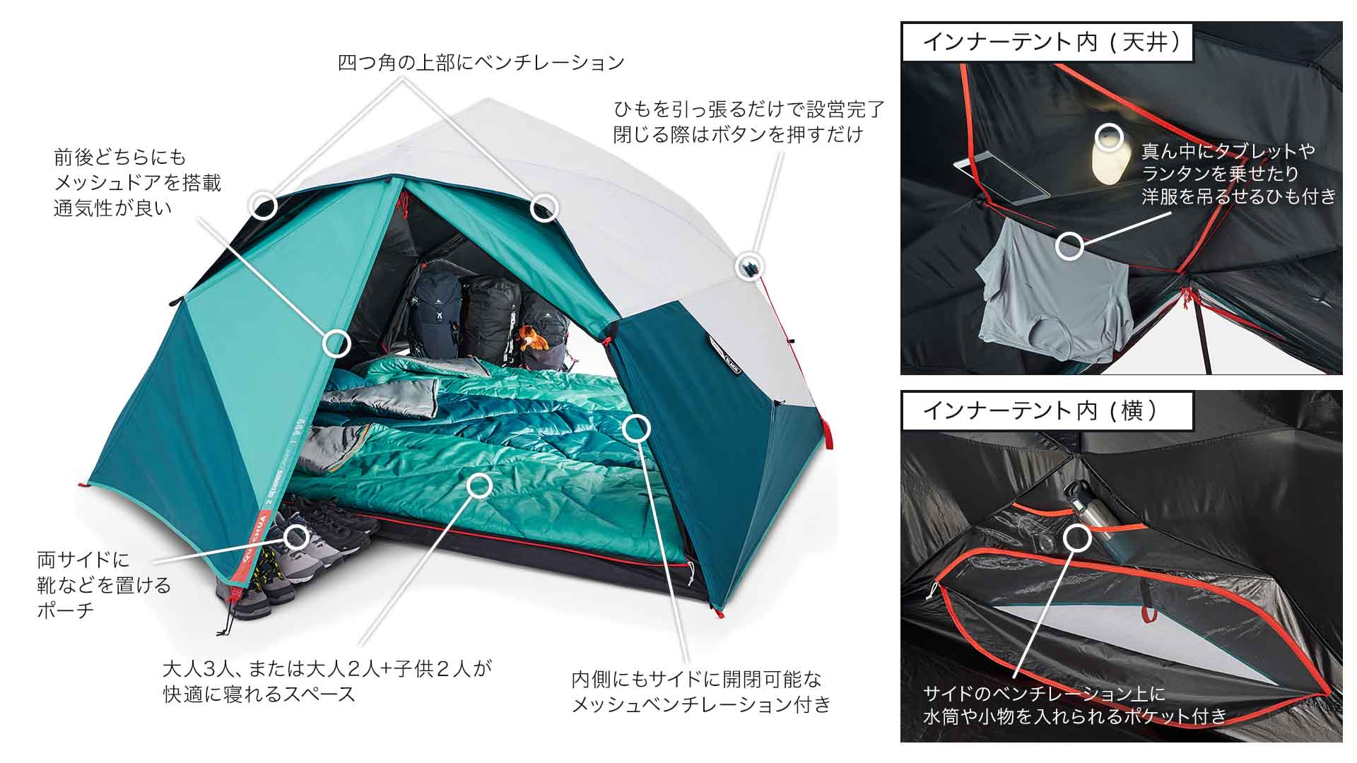2人用から進化した、3人用のワンタッチテント。傘のような構造で、両側からひもを引っ張るだけで設営でき、撤収する際は両サイドのボタンを押して畳むだけ。だれでもかんたんに使いこなせます。フライシートには独自の「FRESH&BLACK」素材を採用で、高い遮熱&遮光性、UPF50+で紫外線をカット。夏でも涼しく過ごせて、中は真っ暗なので朝日に邪魔されることなくぐっすり快眠できます。