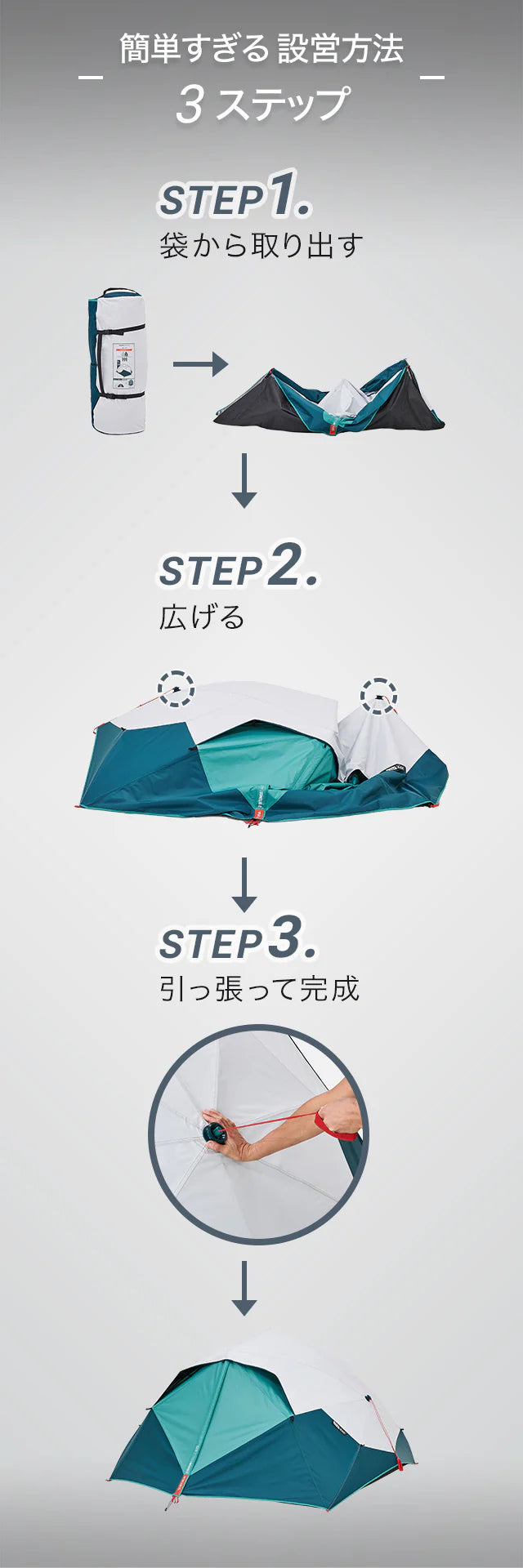 独自の「EASY」システムで、たった1分で設営できます。自立設置型テント。組み立て後に移動して、お好みの場所に配置が可能です。簡単に撤収:畳んだテントをバッグに入れるだけで、簡単に撤収できます。はじめてのご使用でわからない場合には、取扱説明書またはオンライン動画でご確認いただけます。